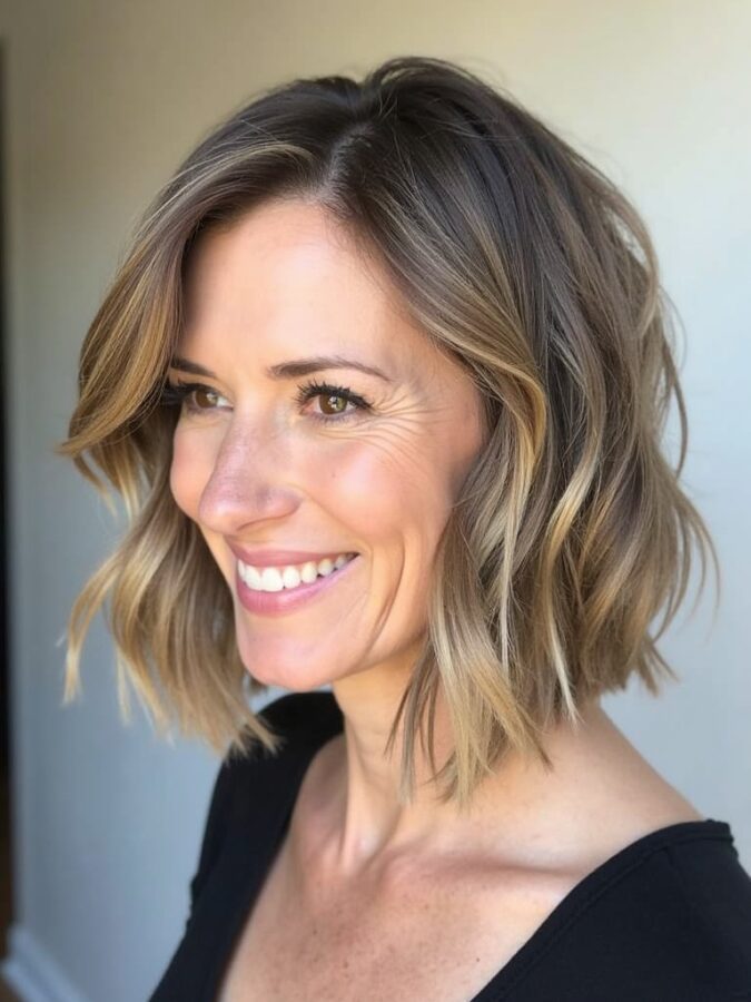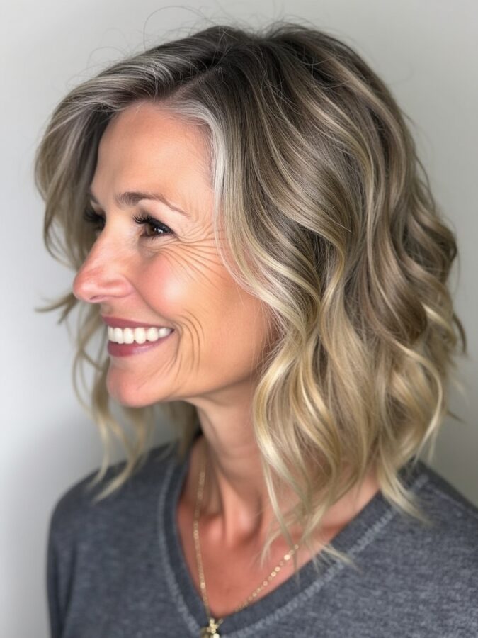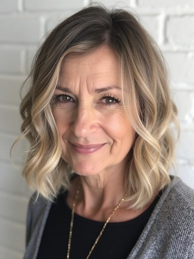 The wavy lob (long bob) strikes a perfect balance between length and manageability, making it a favorite among hairstyles for women over 50 with fine hair. The length typically grazes the collarbone, classifying it as a versatile shoulder-length cut. The addition of waves adds lateral volume, which is crucial for widening the silhouette of fine hair and disguising thin hair. Unlike a sleek straight look that might cling to the head, a wavy style introduces air and bounce. This can be achieved with a curling wand or salt sprays if you have natural texture. It serves as a softer alternative to a rigid bob or a messy shag cut. Asking for choppy ends prevents the waves from looking too uniform or old-fashioned. Dimensional highlights are particularly effective here, catching the light on every bend of the wave. This style revitalizes fine hair, giving fine hair a youthful, energetic bounce that is both modern and age-appropriate.
