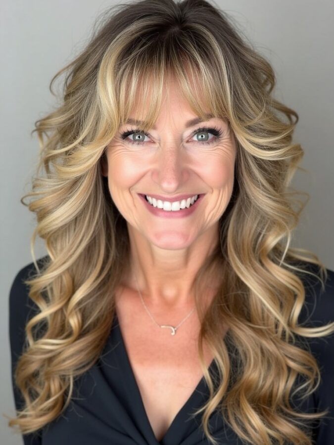 Long layers with bangs are a fantastic choice for those searching for hairstyles for women over 50 who aren’t ready to go short. This look completely avoids the pixie hairstyle route, embracing the luxury of long hair. It is the definitive long hairstyle that maintains volume and health through strategic layering. While it might require slightly more effort than a strict wash and wear cut, the layers make air-drying a viable option. Whether you are a natural blond or cover grays with rich color, adding highlights around the face can brighten your complexion instantly. It is longer than a medium-length cut, providing plenty of styling options like ponytails or updos. This style is particularly beautiful with curly hair, as the layers allow the curls to cascade rather than clump. Even though many advisors suggest going short as you age, women over 50 can look incredibly youthful with flowing locks, provided the hair is kept healthy and well-conditioned.